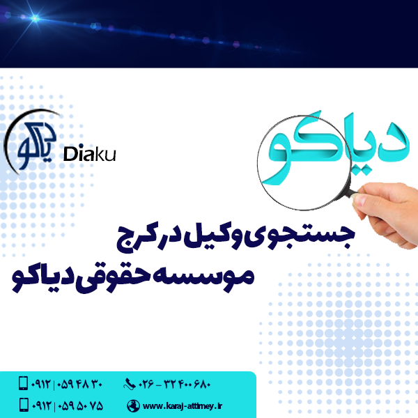 اگر شما در جستجوی وکیل در کرج هستید ما در موسسه حقوقی دیاکو شما را کمک میکنیم که بتوانید بهترین وکیل در کرج را بیابید و با وکیل خوب در کرج در تماس باشید و بتوانید خود را از مسائل قضایی با مشاوره گرفتن از وکیل در کرج دور کنید و در صورت ایجاد اتفاق مسائل قضایی بتوانید آن مشکل را به راحتی حل کیند